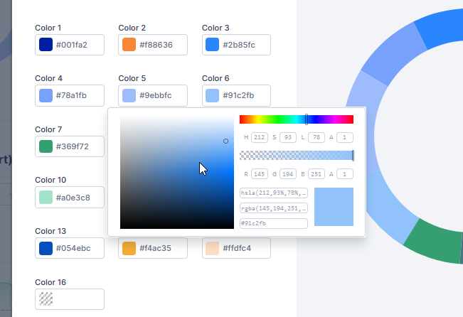 - Hier können Sie bis zu 16 verschiedene Chartfarben auswählen. Ändern Sie hier ggf. die Farben für die einzelnen Kategorien, indem Sie auf die jeweilige Farbe klicken und dann im erscheinenden Farbauswahldialog eine Farbe auswählen. Hierbei stehen Ihnen alle gängigen Farbschemata zur Konfiguration zur Verfügung. Wählen Sie per Mausklick ins Farbfeld oder über die exakte Eingabe von RGBA- HSLA- oder Hexadezimalwerten.