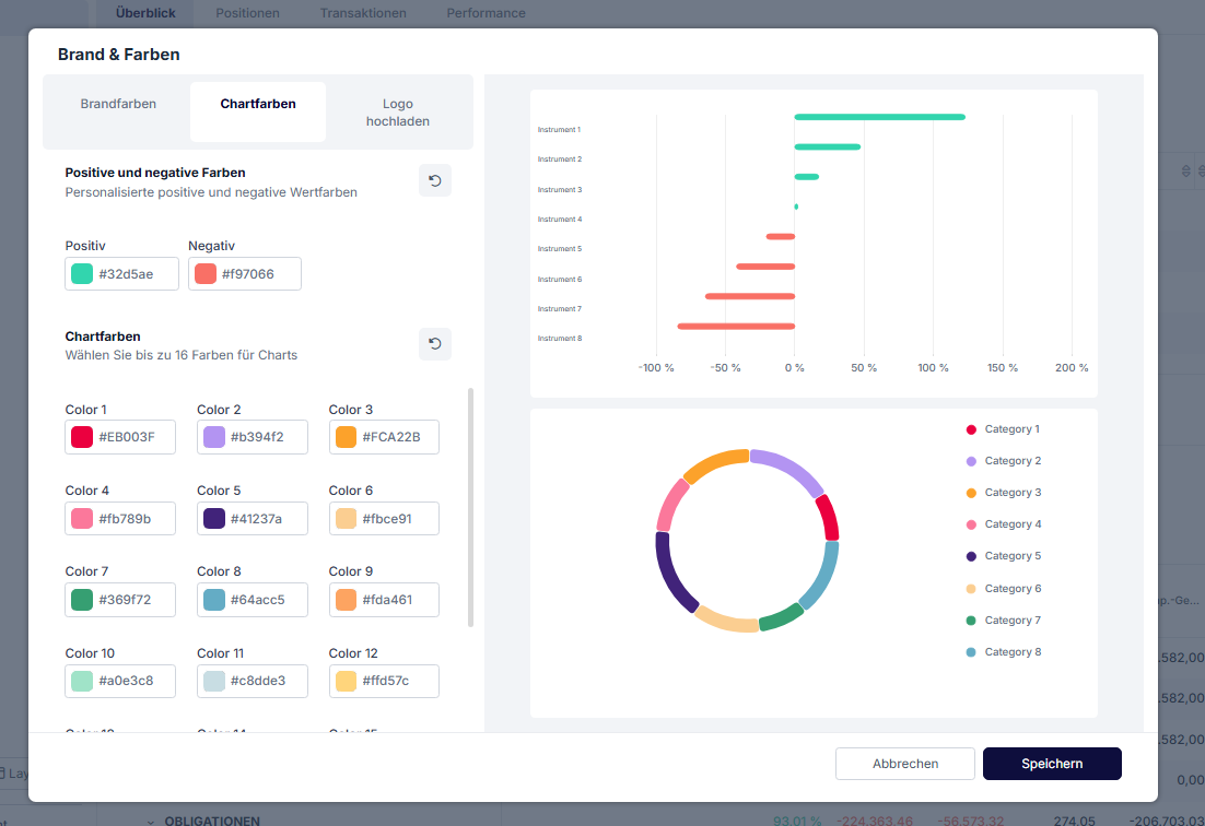 Im Vorschaubereich auf der rechten Seite des Dialogfensters sehen Sie sofort die Auswirkungen Ihrer Änderungen auf die einzelnen Kategorien. - Im Bereich "Positive und negative Farben" können Sie die Farben für positive und negative Werte in Charts (z. B. im Performance-Chart) und auch in Tabellen definieren. Auch hier sehen Sie auf der rechten Seite des Dialogfensters die Auswirkungen Ihrer Änderungen an einem Beispiel.
