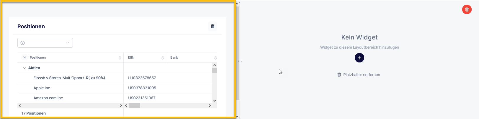 Das Widget wird entfernt und ein Platzhalter wird angezeigt. - Verfahren Sie nun wie oben unter Neues Widget in leeren Platzhaltern hinzufügen beschrieben.