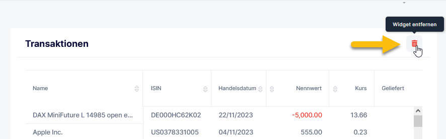 - Wählen Sie im zu ersetzenden Widget das Icon "Widget entfernen".