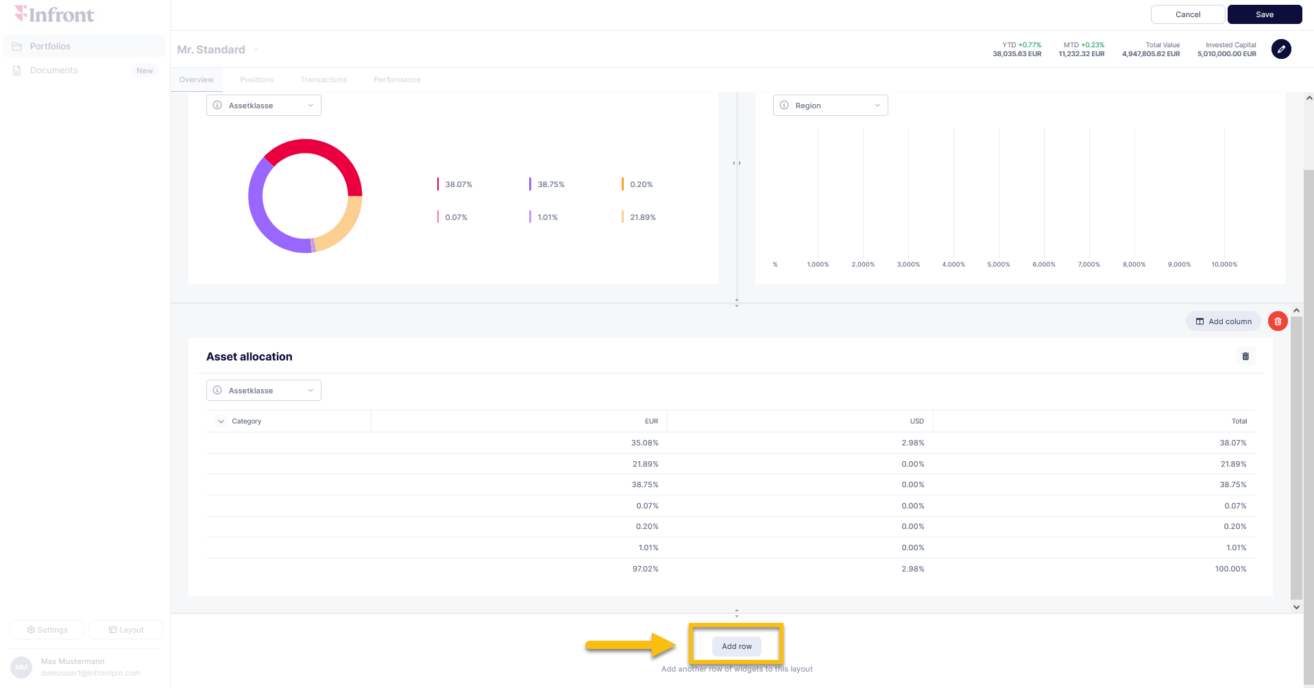 The layout of a tab in the "Portfolios" area consists of widgets arranged in so-called rows. Each row contains one or two widgets in "columns".