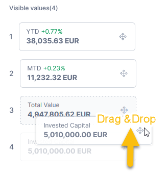 - You can easily change the order of the displayed values using drag & drop with the symbol on the right-hand side of each tile.